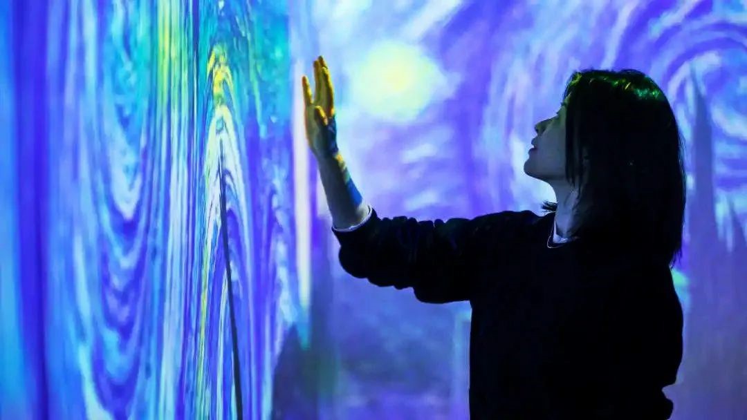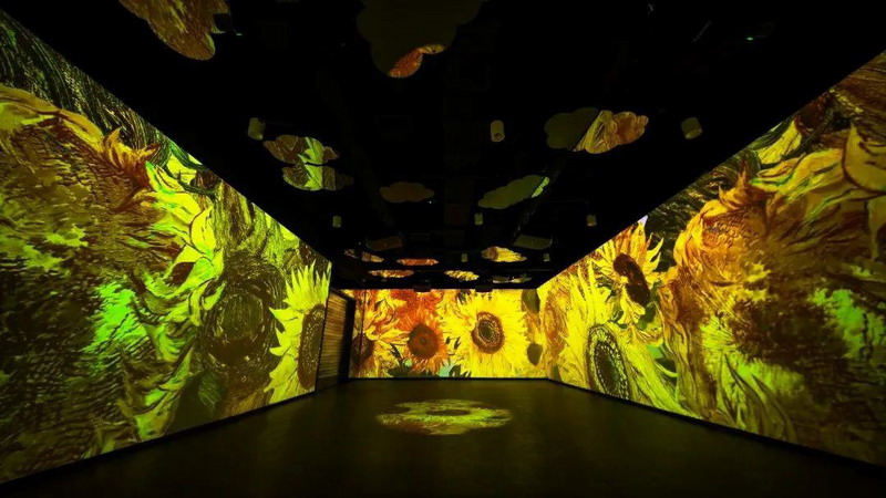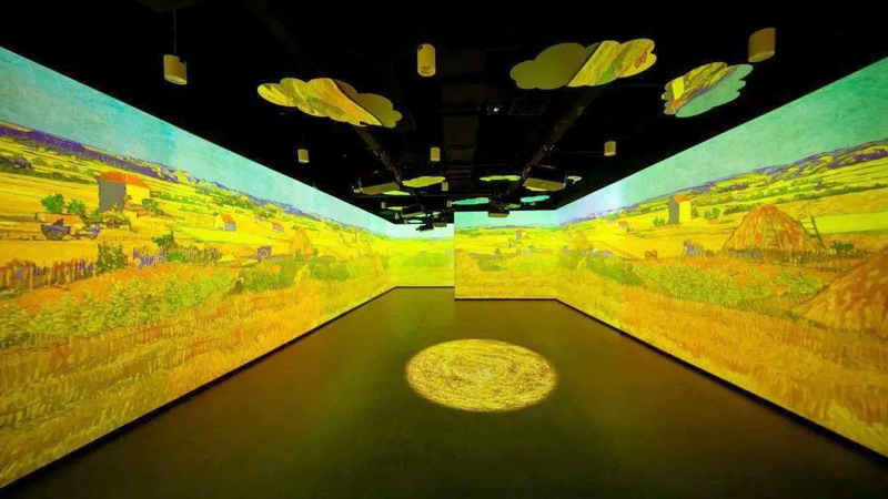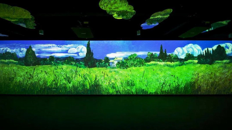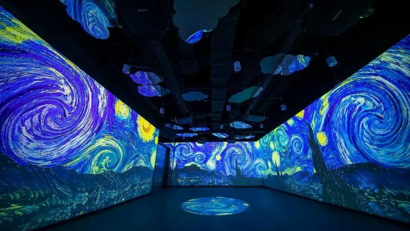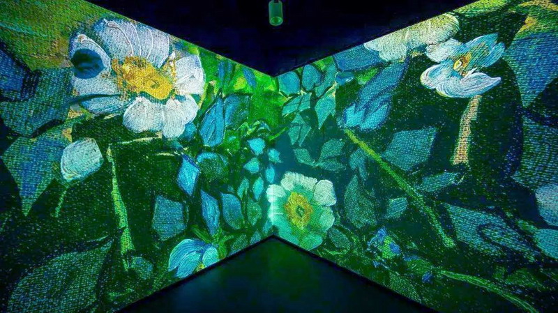 投影系統(tǒng)完成后的數(shù)字體驗館,可以瞬間帶領(lǐng)游客進入“人在畫中央”的模式。頭頂星光閃耀,四周畫彩流動,地面互動妙趣橫生,玫瑰與睡蓮,星空與浮冰,麥田與向日葵光影變幻,音樂宛轉(zhuǎn)悠揚,整個展出充分調(diào)動了視、聽、觸等多種感官體驗,讓旅客在現(xiàn)實與虛擬交織的空間維度里,完成作品與觀眾情感的鏈接,與大師來一場美妙的邂逅。