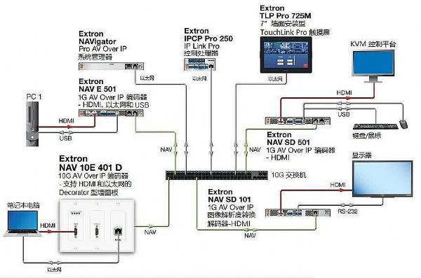 屢獲殊榮的 NAV® 系列是唯一支持 1G 和 10G 設(shè)備無縫互操作的一體化解決方案,有效提升了大規(guī)模系統(tǒng)部署的靈活性和可擴(kuò)展性。同時,它們還支持 IP 架構(gòu)的 AES67 音頻,進(jìn)而能夠與 Extron 廣闊的音頻 DSP 產(chǎn)品型號或其它具有 IP 功能的音頻組件集成。NAV 系統(tǒng)可以部署為基于 IP 架構(gòu)的高性能視音頻矩陣,這樣能夠讓 IP 系統(tǒng)的靈活性與傳統(tǒng)矩陣切換器所集成的友好切換特性“相得益彰”。為滿足專業(yè)視音頻環(huán)境內(nèi)嚴(yán)苛的應(yīng)用需求,Extron 可高度擴(kuò)展且功能強大的 NAV 平臺可實現(xiàn)數(shù)千個端點的視音頻信號安全部署。