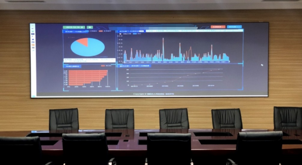 在某檢察院調度室,長虹工程激光投影通過智能融合呈現(xiàn)超寬幅畫面,約220吋的屏幕是整塊的菲涅爾光學屏幕,完全沒有拼縫,圖像尤其是可視化數(shù)據(jù)圖表的展示不會被切割。