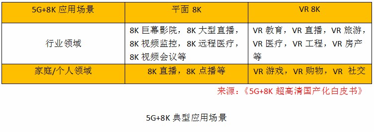 近兩年隨著5G普及進(jìn)程的加快,8K產(chǎn)業(yè)在家庭/個人應(yīng)用領(lǐng)域也得到了快速等發(fā)展,其應(yīng)用場景主要包括8K直播/點播、VR游戲等,相應(yīng)的5G+8K產(chǎn)品雖未真正得到普及,但產(chǎn)品陣營已初步形成。