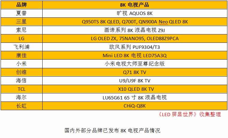 針對8K直播和8K點播,主要產(chǎn)品為8K電視!栋灼分赋,在技術(shù)和市場的雙重驅(qū)動下,電視行業(yè)已經(jīng)經(jīng)歷了標(biāo)清、高清、全高清時代,目前正逐步邁入超高清4K/8K時代。4K電視行業(yè)漸入佳境,近幾年國內(nèi)多個家電廠商正在加大力度投入8K電視的研發(fā),提高了8K應(yīng)用的市場滲透率。2017年8月31日,夏普發(fā)布全球首臺消費級8K電視“夏普曠視AQUOS 8K”,將8K技術(shù)推向民用市場。此后三星、索尼、康佳、小米、創(chuàng)維、海信、TCL、海爾、長虹等國內(nèi)外廠商都相繼加入8K電視陣營,推出不同款式的8K電視,使8K電視在民用市場得到了快速的普及和推廣。