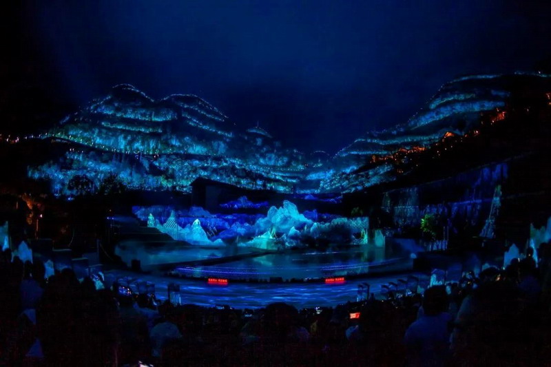 為了創(chuàng)造更生動的沉浸體驗,在本次光影秀中首次使用了觀眾席可升降晶膜屏設(shè)備,并融入燈光動態(tài)編程、崖壁激光成像、包裹式全景音響等前沿技術(shù)。通過編程集控同步調(diào)動,讓觀眾宛若置身其間,在導(dǎo)演精心營造的一幕幕繽紛幻境中酣暢神游。