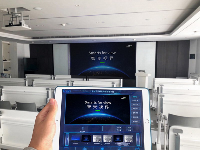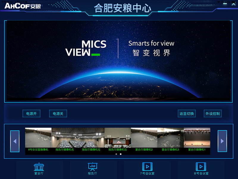 在合肥安糧中心項(xiàng)目中,通過(guò)MICS云一體化解決方案,能夠?qū)ūO(jiān)控視頻、攝像頭,DSP,投影機(jī),LED,燈光等在內(nèi)的多樣信息匯聚在MICS云中,工作人員可在PAD端對(duì)以上音視頻信息及外部設(shè)備進(jìn)行可視化調(diào)度,包括上屏、監(jiān)控視頻預(yù)覽、攝像頭角度切換、投影機(jī)開關(guān)、燈光調(diào)整等操作,省時(shí)便捷。同時(shí),MICS云平臺(tái)還支持一鍵系統(tǒng)開關(guān)機(jī),能夠有效避免系統(tǒng)不使用時(shí)部分機(jī)器空轉(zhuǎn)導(dǎo)致費(fèi)電情況的發(fā)生。