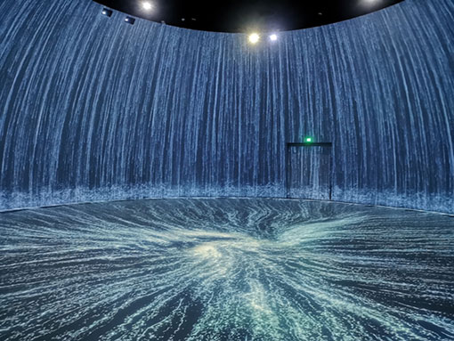 “飛流直下三千尺,疑是銀河落九天”,大詩人李白描述的壯美奇景在這里“真實”再現(xiàn)。宛如蛋殼的球幕展廳里,巨型瀑布傾瀉而下,似銀河從天而降,并在地面迅速匯聚成河,波光粼粼、浩瀚無垠,令觀者贊嘆不已。得以呈現(xiàn)如此雄偉壯觀的瀑布奇景,離不開20臺NEC 4K激光投影機PX1005QL-B+的精彩演繹。巨型碗幕直徑15.4米,高度5.9米,20臺NEC PX1005QL-B+通過隱藏式安裝,采用融合拼接的方式,分別在近百平方米的弧形墻面和圓形地面上進行投射,打造沉浸式互動投影,將觀眾帶到“廣闊無邊”的水世界中,感受瀑布飛流直下的壯麗美景。