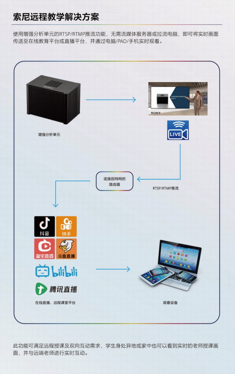 在確保讓在教室內(nèi)的學生和老師得到很好的體驗的同時,索尼產(chǎn)品還實現(xiàn)了讓網(wǎng)絡課堂、異地校區(qū)的同學們得到同樣理想的授課體驗。索尼增強分析單元(小魔盒)的RTMP推流功能,可以將遠程課堂的畫面實時的推送到任何直播平臺上(例如Bilibili),學生可以使用電腦、手機、Pad等設備完整地觀看和聆聽遠程課堂的實況內(nèi)容。并且小魔盒的PTZ自動追蹤功能和姿勢感應放大功能可以讓攝像機完全自動的捕獲老師和學生的特寫畫面,不需要任何人工操作的干預,真正實現(xiàn)無人值守的遠程課堂體驗,解放了學校電教人員的精力。