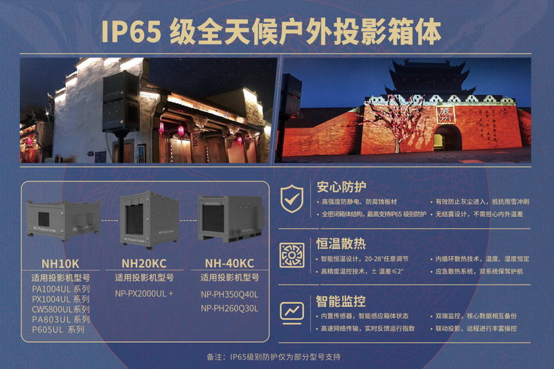 NH20KC是專門為NEC PX2000UL+量身定制的戶外投影箱體,采用全密閉箱體結(jié)構(gòu),防塵、防水等級最高達(dá)到IP65級別防護(hù),無懼灰塵、風(fēng)雨侵蝕;擁有智能恒溫和應(yīng)急散熱雙系統(tǒng),為投影應(yīng)用保駕護(hù)航;雙控制系統(tǒng)令操控更加便捷。安心防護(hù)、恒溫散熱、智能監(jiān)控的三大優(yōu)勢,令NH20KC和PX2000UL+完美匹配,確保投影機(jī)在戶外多變的工作環(huán)境中能夠長時間穩(wěn)定運(yùn)行。不僅如此,針對NEC PA1004UL系列、PX1004UL系列、CW5800UL系列、PA803UL系列、P605UL系列及NEC PH350Q40L、PH260Q30L等投影機(jī)都分別定制了NH10K和NH40KC IP65級全天候戶外投影箱體,為客戶提供完善的一體化戶外投影解決方案。