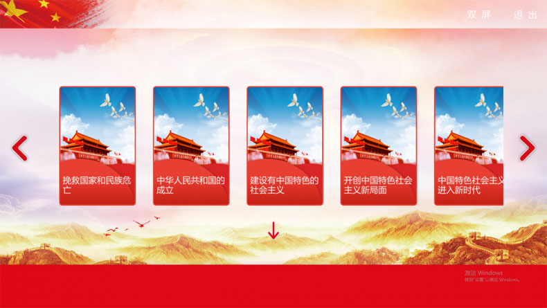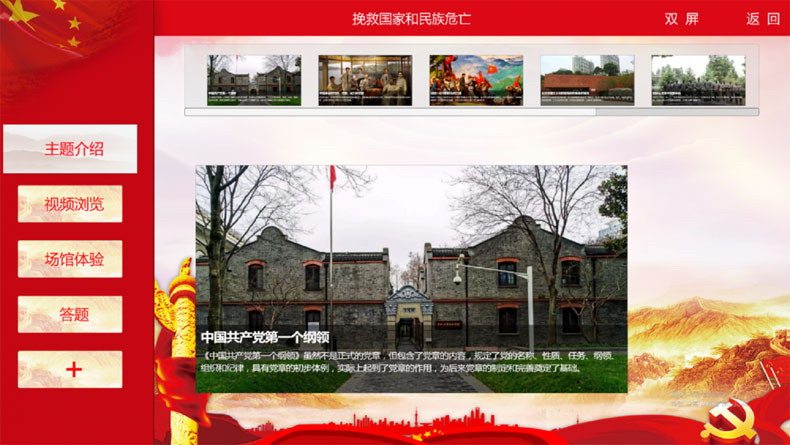 虛擬展館總面積達(dá)10000平米(模擬),運(yùn)用3D和VR全景技術(shù),采取多媒體互動疊加圖文、音視頻熱點(diǎn)植入等形式,并配置答題測評系統(tǒng),生動再現(xiàn)“百年征程”背后的故事,多維度強(qiáng)化學(xué)習(xí)記憶。