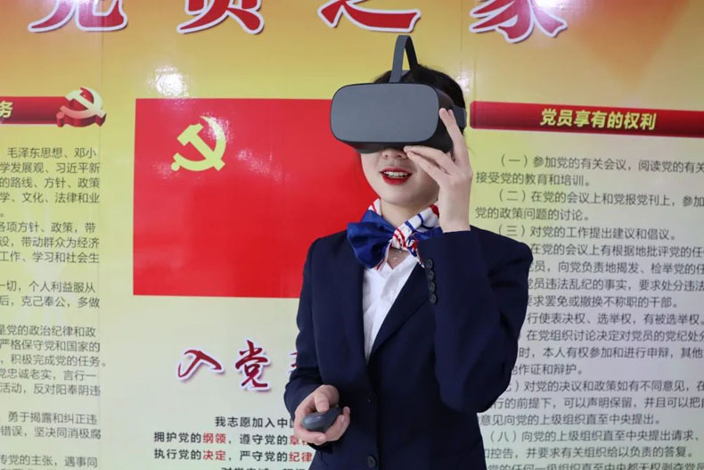 目前,黨史館內(nèi)配備了4副VR眼鏡。如果同時前往學(xué)習(xí)的員工較多,黨史館可轉(zhuǎn)為大視屏瀏覽的形式,供多人學(xué)習(xí)觀看。