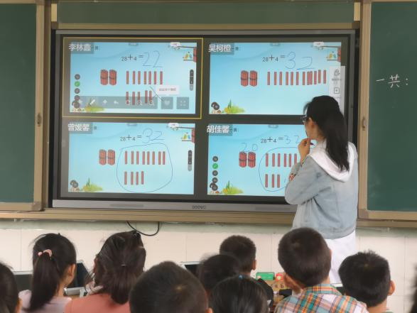 針對這樣的情況,張老師通過創(chuàng)設貼近生活的場景,引出加法算式,并通過課件推送下發(fā)到學生平板上,讓學生自主完成算式。隨后,學生上傳結(jié)果,老師進行講解、總結(jié)學生計算方式,并通過拍照上傳答案、收集全班學生作答結(jié)果,實現(xiàn)全員參與。在課堂中,張老師還發(fā)起搶答,抽選學生上臺做豎式,結(jié)合拍照上傳收集答案,同學進行互評,真正做到了將課堂還給學生。最后張老師開展的有趣生動的課堂活動,讓這一堂頗具趣味性的課堂完美結(jié)束。