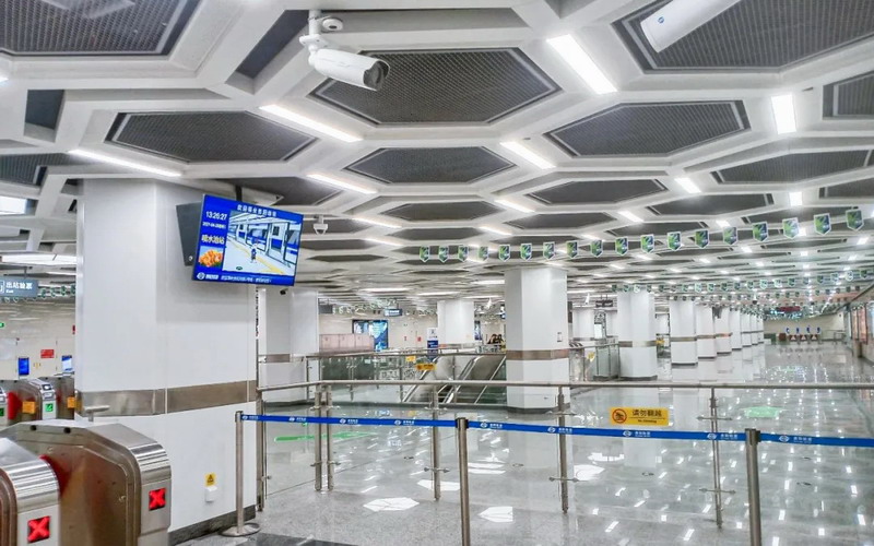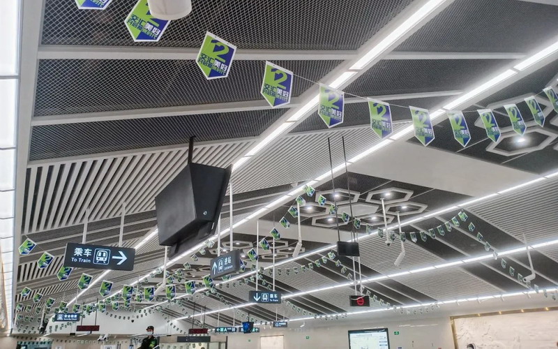 站廳層照明,照明設(shè)計方面使用直接照明、間接照明、重點照明結(jié)合應(yīng)急照明與個性照明的方式,為各區(qū)域提供優(yōu)質(zhì)的照明環(huán)境,以保證充足的照度、合理的眩光值,使旅客出行得到理想的照明保障。采用反射式發(fā)光技術(shù)開發(fā)的照明燈具和嵌入式陶瓷像素筒燈,見光不見光源,亮度充足無眩光,能為乘客提供舒適的照明環(huán)境。