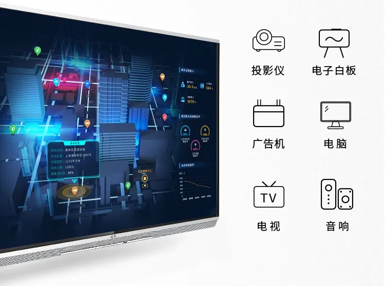 實際應用時,可根據(jù)會議場景布局及空間大小打造不同尺寸的應用解決方案。固定場所下可采用壁掛固定式安裝,非固定會議場所則采用落地式安裝,搭配移動推車,實現(xiàn)靈活辦公。