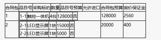一、項(xiàng)目基本情況 項(xiàng)目編號(hào):QTXQ-GK-2021-088(2) 項(xiàng)目名稱:杭州錢塘區(qū)中小學(xué)、幼兒園觸控一體機(jī)采購項(xiàng)目(第二次招標(biāo)) 預(yù)算金額(元):9096000 最高限價(jià)(元):8195000,901000 采購需求: 標(biāo)項(xiàng)一 標(biāo)項(xiàng)名稱:錢塘區(qū)中小學(xué)觸控一體機(jī)采購 數(shù)量:1 預(yù)算金額(元):8195000 簡要規(guī)格描述或項(xiàng)目基本概況介紹、用途:包括杭州錢塘區(qū)中小學(xué)觸控一體機(jī)及配套設(shè)備(具體見設(shè)備清單),其中包含貨物供貨、舊設(shè)備拆除、安裝調(diào)試、貨物驗(yàn)收、培訓(xùn)、質(zhì)保期內(nèi)的售后服務(wù)等。 備注:無 標(biāo)項(xiàng)二 標(biāo)項(xiàng)名稱:錢塘區(qū)幼兒園觸控一體機(jī)采購 數(shù)量:1 預(yù)算金額(元):901000 簡要規(guī)格描述或項(xiàng)目基本概況介紹、用途:包括杭州錢塘區(qū)幼兒園觸控一體機(jī)及配套設(shè)備(具體見設(shè)備清單),其中包含貨物供貨、舊設(shè)備拆除、安裝調(diào)試、貨物驗(yàn)收、培訓(xùn)、質(zhì)保期內(nèi)的售后服務(wù)等。 備注:無 合同履約期限:標(biāo)項(xiàng) 1、2,合同簽訂后55日內(nèi)供貨安裝到位,安裝完成后5日內(nèi)完成調(diào)試,設(shè)備安裝調(diào)試完成后1個(gè)月內(nèi)進(jìn)行驗(yàn)收。 本項(xiàng)目(否)接受聯(lián)合體投標(biāo)。二、申請(qǐng)人的資格要求: 1.滿足《中華人民共和國政府采購法》第二十二條規(guī)定;未被“信用中國”(www.creditchina.gov.cn)、中國政府采購網(wǎng)(www.ccgp.gov.cn)列入失信被執(zhí)行人、重大稅收違法案件當(dāng)事人名單、政府采購嚴(yán)重違法失信行為記錄名單。 2.落實(shí)政府采購政策需滿足的資格要求:無 3.本項(xiàng)目的特定資格要求:無 本招標(biāo)項(xiàng)目僅供正式會(huì)員查閱,您的權(quán)限不能瀏覽詳細(xì)信息,請(qǐng)點(diǎn)擊 注冊(cè) / 登錄 ,或聯(lián)系工作人員辦理會(huì)員入網(wǎng)事宜,成為正式會(huì)員后方可獲取詳細(xì)的招標(biāo)公告、報(bào)名表格、項(xiàng)目附件及部分項(xiàng)目招標(biāo)文件等。