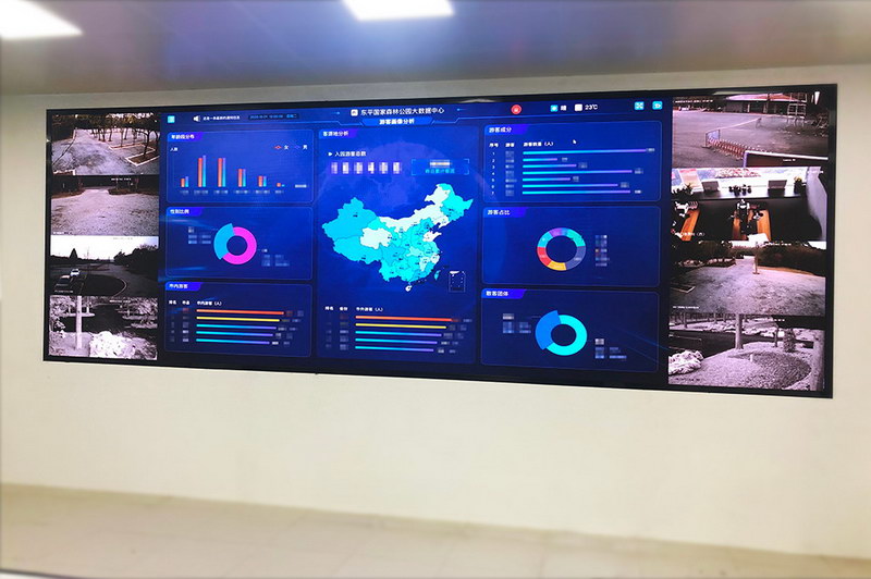 在該項目中,為達(dá)到工作人員能夠一屏統(tǒng)覽園區(qū)全貌的效果,大數(shù)據(jù)信息包括游客成分、停車場數(shù)據(jù)、總客流量、累積客流、當(dāng)前在園人數(shù)、出入門客流、訂單信息、輿情監(jiān)測等在內(nèi)的大數(shù)據(jù)統(tǒng)計都以可視化的形式呈現(xiàn)在東平國家森林公園大數(shù)據(jù)中心內(nèi)部的大屏上。