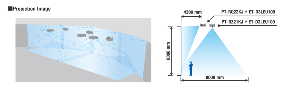 通過垂直安裝的兩臺(tái)PT-RZ31KJ(中國型號(hào)PT-SRZ31KC)投影機(jī)完成投影。兩臺(tái)投影機(jī)負(fù)責(zé)一個(gè)區(qū)域的高亮度視頻投射。