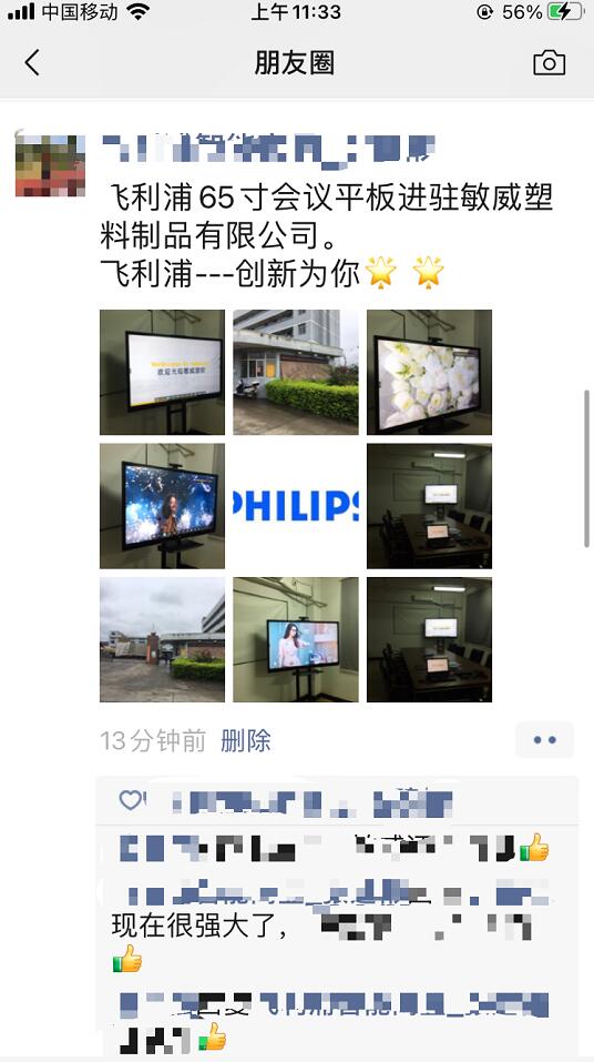 在對(duì)飛利浦智能會(huì)議平板的實(shí)際應(yīng)用中,福州敏威塑料制品有限公司的員工們對(duì)于產(chǎn)品的辦公體驗(yàn)好評(píng)如潮!并通過(guò)朋友圈圖片及視頻的轉(zhuǎn)發(fā)評(píng)論,分享彼此在使用后的心得。原本老舊的會(huì)議廳,因?yàn)橛酗w利浦智慧平板的加入企業(yè)員工帶來(lái)了良好的辦公環(huán)境提升。
