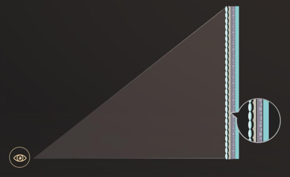 對于大部分普通消費者而言,我們對于幕布的認知仍然停留在表面的涂層,這也是為什么在面對眼花繚亂的涂層材料時我們會感到無從下手。事實上,無論是“納米”還是“微晶”,所有專業(yè)名詞的點綴都沒有從根源上解決問題,而極米的幕布之所以專業(yè),是因為其不僅在幕布材質(zhì)上進行了創(chuàng)新,還應(yīng)用了大量的光學(xué)技術(shù)和原理。以極米的光子幕布2.0為例,極米在幕布的基底反射層利用反射鏡機制構(gòu)建了光學(xué)諧振腔,實現(xiàn)了透鏡光的高效再利用,而成像層則用于反射后光線的匯聚,以呈現(xiàn)出清晰、銳利的影像,然后這些影像再通過精密的微透鏡結(jié)構(gòu)反射至人眼,并且在此過程中完成光路的控制,大幅降低光損并實現(xiàn)高增益,最后,在光學(xué)配光層的加持下,極米光子幕布2.0還能夠為用戶提供更靈活的投射角度和可視角度。