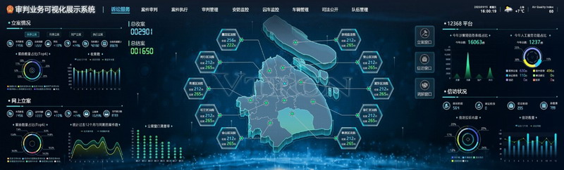 實時匯聚立案情況、網(wǎng)上立案、信訪情況、訴訟對調等業(yè)務信息,結合案件分布及視頻監(jiān)控,實時分析統(tǒng)計中級法院及基層法院立案、信訪、訴調中心的接收案件數(shù)量,全局總覽訴訟情況,并從12368平臺的人工服務、涉案短信的數(shù)量來洞悉關系人的反饋意見。