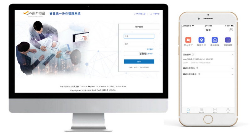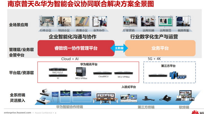 “睿致統(tǒng)一協(xié)作平臺”與“華為智能協(xié)作平臺”是全場景智能協(xié)同解決方案的兩大核心。以南京普天睿致統(tǒng)一協(xié)作平臺為綜合管理應(yīng)用系統(tǒng),面向會議的業(yè)務(wù)流程管理,面向會議室及設(shè)備資源的管控,簡化管理和控制,提升會議及協(xié)作效率。以華為智能協(xié)作平臺(“平臺+端”)為核心協(xié)作系統(tǒng),發(fā)揮華為在音視頻領(lǐng)域的深厚積累,以云、聯(lián)接、AI等新ICT技術(shù)積淀,為企業(yè)提供云時代的生產(chǎn)力工具。華為智能協(xié)作平臺與南京普天睿致統(tǒng)一協(xié)作平臺具備良好的兼容性,兩個平臺的無縫兼容,將華為、南普雙方在技術(shù)、產(chǎn)品上的優(yōu)勢發(fā)揮到極致,也真正克服了金融大企業(yè)在信息化升級過程中面臨的統(tǒng)一管控等困難,覆蓋到企業(yè)“行政會議、培訓(xùn)會議、遠程面試”以及諸如“遠程面簽、廳堂營銷”等行業(yè)業(yè)務(wù)場景。