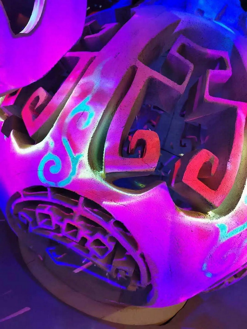 “夜貓子集”光影秀一共采用了17臺超高清雙色激光工程投影機,其中墻面6臺(顯示尺寸:25.6m*2.6m,分辨率:21000*2160)、地面8臺(顯示尺寸:9.6m*7.6m,分辨率:9216*5184)、妖魂塔3臺(顯示尺寸:3.2m*1.9m,分辨率:3456*1200),整個方案光路設計和融合技術十分復雜,通過多次模擬搭建、實物1:1預搭建的方式規(guī)避了多項干涉和融合問題,才能實現(xiàn)最終完美效果。