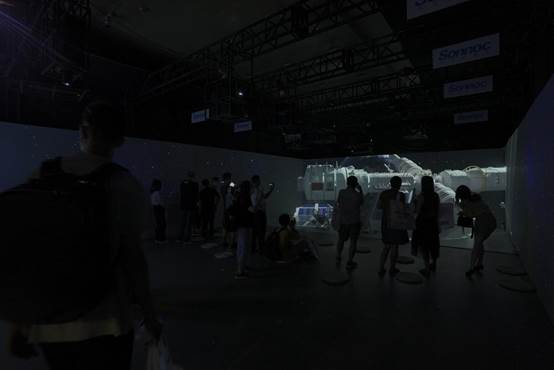 人類源自星塵,地球在宇宙中就如一粒塵埃。 作為展項(xiàng)的第一站,宇宙微塵現(xiàn)場(chǎng)人氣爆棚,參觀人潮更是絡(luò)繹不絕。索諾克用14臺(tái)10500