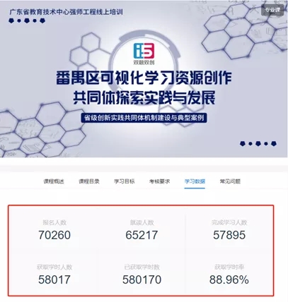 2020年,番禺區(qū)學(xué)習(xí)共同體平臺(tái)課程入選廣東省教育技術(shù)中心強(qiáng)師工程(以下簡(jiǎn)稱“強(qiáng)師工程”)在線培訓(xùn)課程。目前,“強(qiáng)師工程”共組織兩期大規(guī)模培訓(xùn),惠及全省7萬(wàn)余名教師,培訓(xùn)時(shí)長(zhǎng)近60萬(wàn)學(xué)時(shí)。