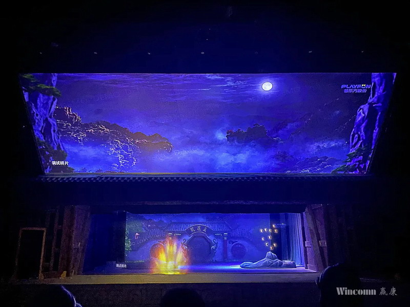 劇場投影場景共分為三個部分,分別是主舞臺上方的天幕,舞臺中間的幻影成像,以及舞臺后方的場景切換投影區(qū)域。