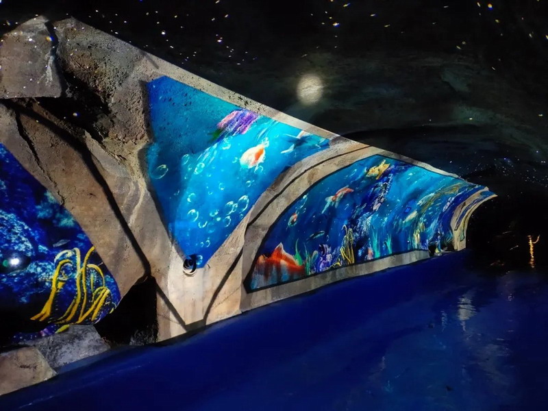 順著漂流的路線,游客率先來到唯美夢幻的1號溶洞,以海洋中的淺海世界為原型,8臺NEC液晶激光工程投影機PA703UL+(7000流明、WUXGA分辨率)搭載8臺定制化IPX5級防水投影箱體NH10K嵌入溶洞墻壁安裝在一側,采用沉浸式半影投射出生動有趣、絢麗多彩的海洋世界。