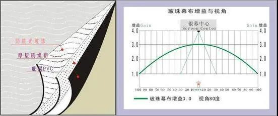 對于投影幕布的性能而言,最重要的是要看幕布的反光能力,通常用“增益”來描述。如果在完全漫反射面上投射光線,此時的反射亮度即為1。而在同一條件下,向屏幕垂直的方向投射同樣的光線,測定中心點和同一圓弧上各點的亮度,這個亮度和完全漫反射的亮度比值即是屏幕的增益。