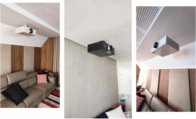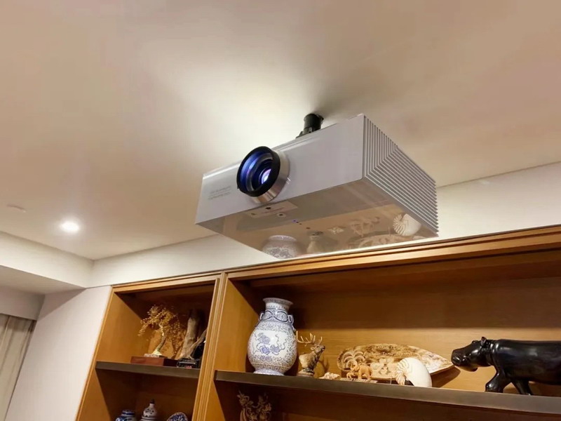 Crytal4-Sh白色款吊頂與客廳相得益彰,通過編程可一鍵實現(xiàn)16:9與2.35:1之間的切換,輕松投影140寸編織透聲幕。
