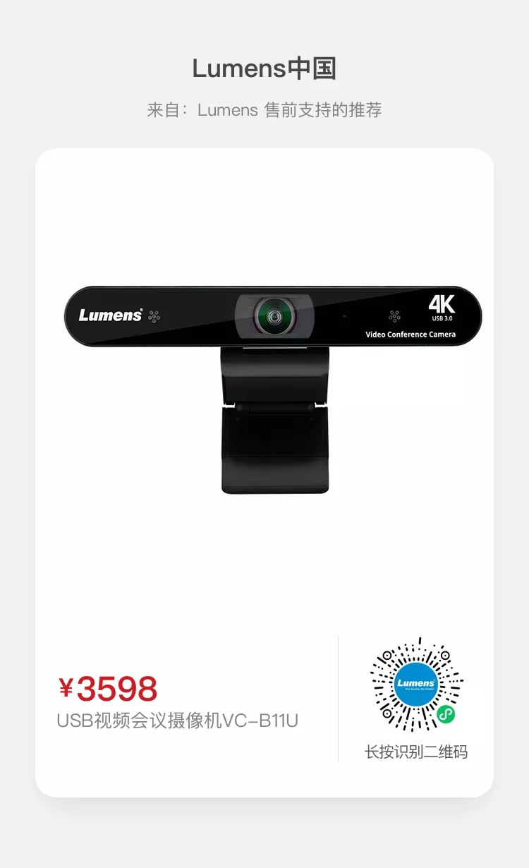 Lumens視頻會(huì)議攝像機(jī)VC-B11U外設(shè)設(shè)計(jì)非常簡潔,將攝像頭、麥克風(fēng)一體設(shè)計(jì),不需要像傳統(tǒng)的會(huì)議攝像系統(tǒng)要分開安裝多種設(shè)備,讓會(huì)議室到處都是凌亂的線,主機(jī)部分尺寸為30mm*210mm*35mm,重量為0.5kg,如果有多個(gè)會(huì)議室,臨時(shí)拆卸安裝也比較方便。