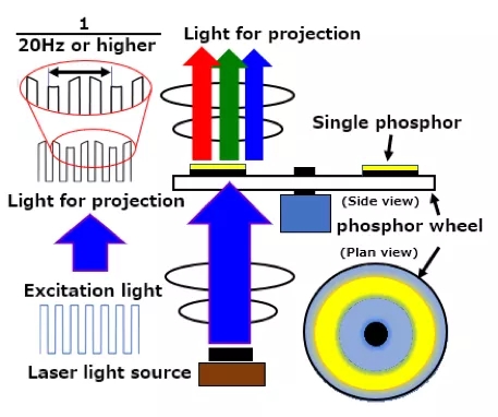 本次獲獎的研發(fā)是一種利用激光光源和熒光輪產(chǎn)生紅、綠、藍(lán)投影光的技術(shù)。此外,激光光源以數(shù)字化閃爍方式調(diào)節(jié)亮度,同時防止在投影圖像中出現(xiàn)閃爍。有了這項(xiàng)技術(shù),激光投影機(jī)的亮度和畫質(zhì)都有了提升。