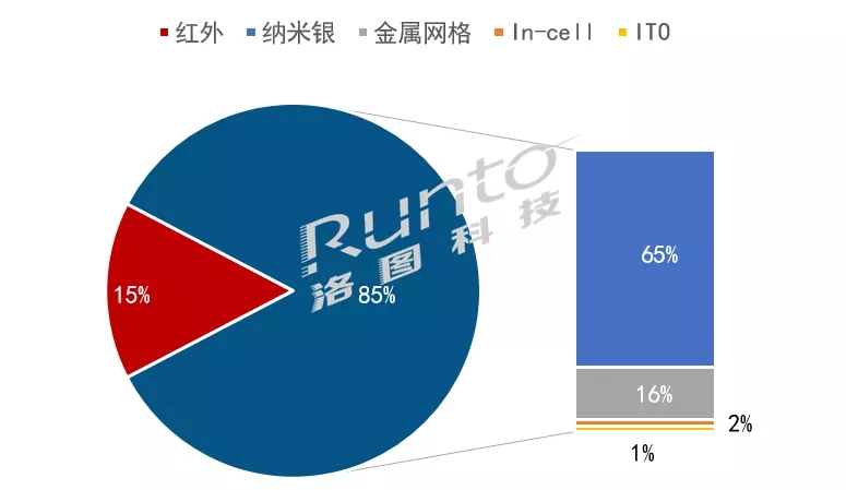 液晶黑板的觸控技術(shù)中,紅外出貨量占15%,電容產(chǎn)品占比85%。整體電容產(chǎn)品中,納米銀技術(shù)占比已達(dá)77%,金屬網(wǎng)格技術(shù)占比18%。