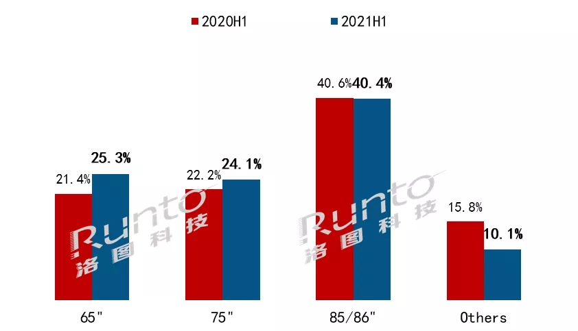 液晶白板產(chǎn)品中,關(guān)注度最高的是86寸產(chǎn)品,用戶端采購需求旺盛,上游面板緊缺、價(jià)格飆漲。據(jù)洛圖科技(RUNTO)數(shù)據(jù)顯示,2021年上半年,85/86寸產(chǎn)品市占達(dá)40.4%,其中以86寸為主。另外,液晶白板雙拼方案增加,而65寸產(chǎn)品在此類方案中應(yīng)用較多,因此65寸產(chǎn)品的市占上升接近4個(gè)百分點(diǎn),比重達(dá)到25.3%。
