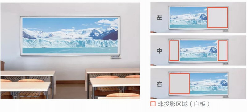 L730U系列支持16:6寬屏模式,最大屏幕尺寸可達(dá)452英寸,并且可以通過遙控器調(diào)整屏幕位置,這樣可以留出非投影區(qū)域,用戶可以在無影像區(qū)域進(jìn)行板書書寫。