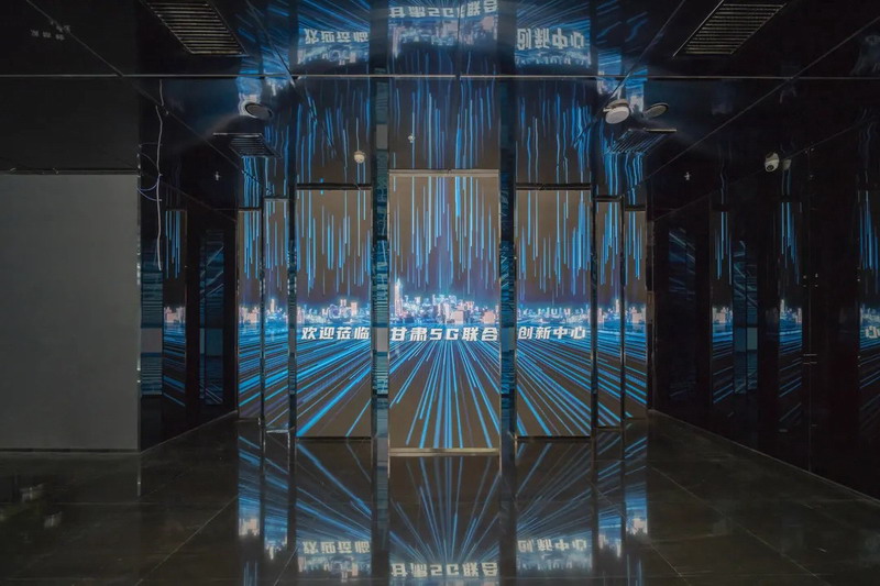 步入展廳開場區(qū),一塊4K高清LED顯示屏正播報中國移動、甘肅移動的發(fā)展史。再往前就到了時光隧道,兩塊超10米的4K全連LED顯示屏展示1G到5G通信技術(shù)的滄海巨變及最新技術(shù),與隧道頂部寓意為“一帶一路”和“黃河”的燈帶營造出神秘的氛圍,穿梭其中仿佛從歷史走向未來。