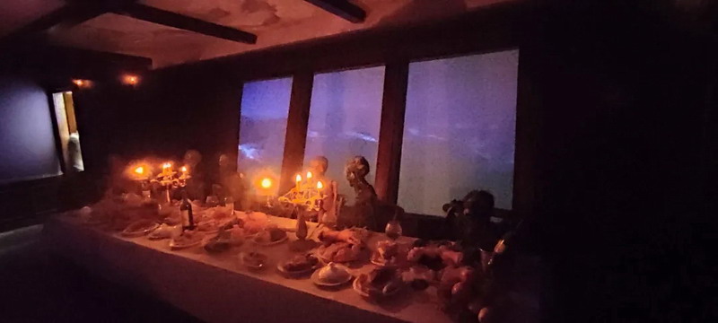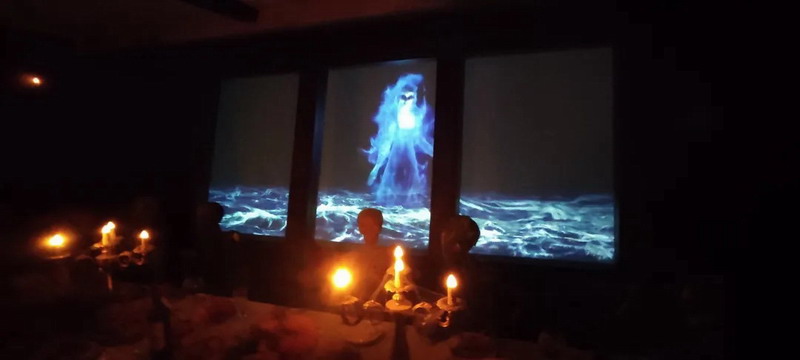 船艙內(nèi),通過科影達投影機打造出了海上狂風(fēng)暴雨的情景,漆黑的天空,呼嘯的海風(fēng)和翻涌的黑色海水,讓整條“船”仿佛就要沉沒一般岌岌可危,給游客帶來視覺上的沖擊,讓游客產(chǎn)生緊張的心理壓力,也讓整個鬼屋體驗更加刺激驚險。