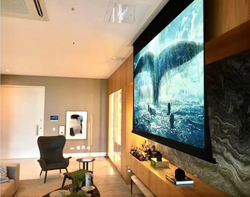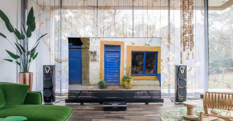 來自荷蘭的XTV 4K案例,兩面落地玻璃的大客廳,能兼顧HIFI和影院。亮點(diǎn)是這塊定制的電動地拉超短焦抗光幕,幕面底部定制了網(wǎng)狀結(jié)構(gòu),完美地讓中置聲音透出來的同時又擁有一個超大畫面。