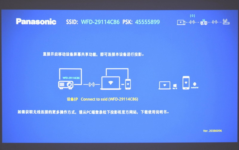 支持Miracast,讓用戶輕松“一鍵投屏”是松下PT-WZ3600的一大亮點,其內置5GHz/2.4GHz雙通道熱點,無須任何連接線,也無需其他軟件,電腦(Win10 系統(tǒng)及以上)、安卓系統(tǒng)(9.0 版本及以上)手機或平板可將屏幕鏡像在投影畫面中,步驟簡便,輕松快投,非常易用。