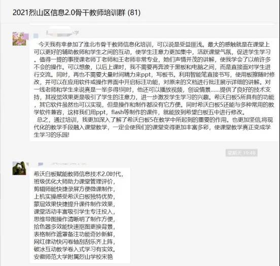 對(duì)此次線上培訓(xùn),學(xué)習(xí)群里的老師們紛紛表示受益頗多。其中一位老師在線上反饋道:“在最近幾年的教學(xué)中,總感覺(jué)傳統(tǒng)課件缺少與學(xué)生互動(dòng)的環(huán)節(jié),PPT中的角色設(shè)置、素材收集與心目中的預(yù)期效果差別很大。今天有幸參加希沃培訓(xùn),有醍醐灌頂?shù)母杏X(jué),這幾年來(lái)的問(wèn)題和困惑都得到了解決。這個(gè)培訓(xùn)來(lái)得太及時(shí)了!培訓(xùn)效果非常好!收獲頗豐!”