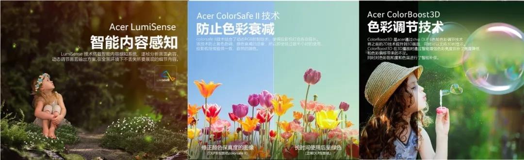 得益于Acer ColorSafe II 第二代色彩保真技術,避免長時間使用后色彩失衡,保證色彩真實亮麗,體現(xiàn)DLP技術的優(yōu)勢。同時,Acer LumiSense智能感光技術,搭載智能內容感知系統(tǒng),逐幀分析畫面內容,動態(tài)調節(jié)畫面輸出方案,在全黑環(huán)境下不丟失所要展現(xiàn)的細節(jié)內容。在播放3D影片時,Acer ColorBoost3D躍彩技術通過智能增強色彩亮度彌補亮度降低和色彩便宜是帶來的不足,同時對色彩飽和度和色溫進行了智能補償。