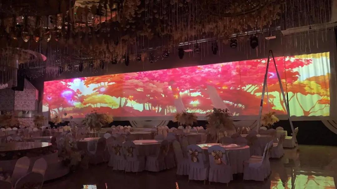 富貴滿堂酒店全息宴會廳,主要投影區(qū)域是宴會廳主持臺兩側(cè)的墻面,每側(cè)墻面長約20米,由于考慮到該宴會廳現(xiàn)有的安裝條件,為避免在投影畫面受到宴會廳現(xiàn)場吊頂裝飾物以及射燈的影響,采用的投影機必須光源壽命長,投影距離小、亮度要高、色彩要艷麗、投影尺寸要大等,經(jīng)過綜合考量,最終選用了ROLY專業(yè)短焦系列激光投影機。