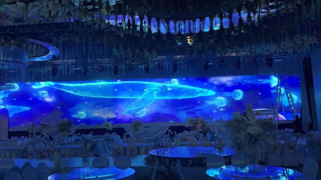 宴會廳選擇用投影機打造全息宴會廳主要在于投影機表達主題的豐富性和色彩表現(xiàn)的優(yōu)越性,而且投影畫面的渲染技術(shù)所呈現(xiàn)出的畫面渾然一體,恢弘大氣。