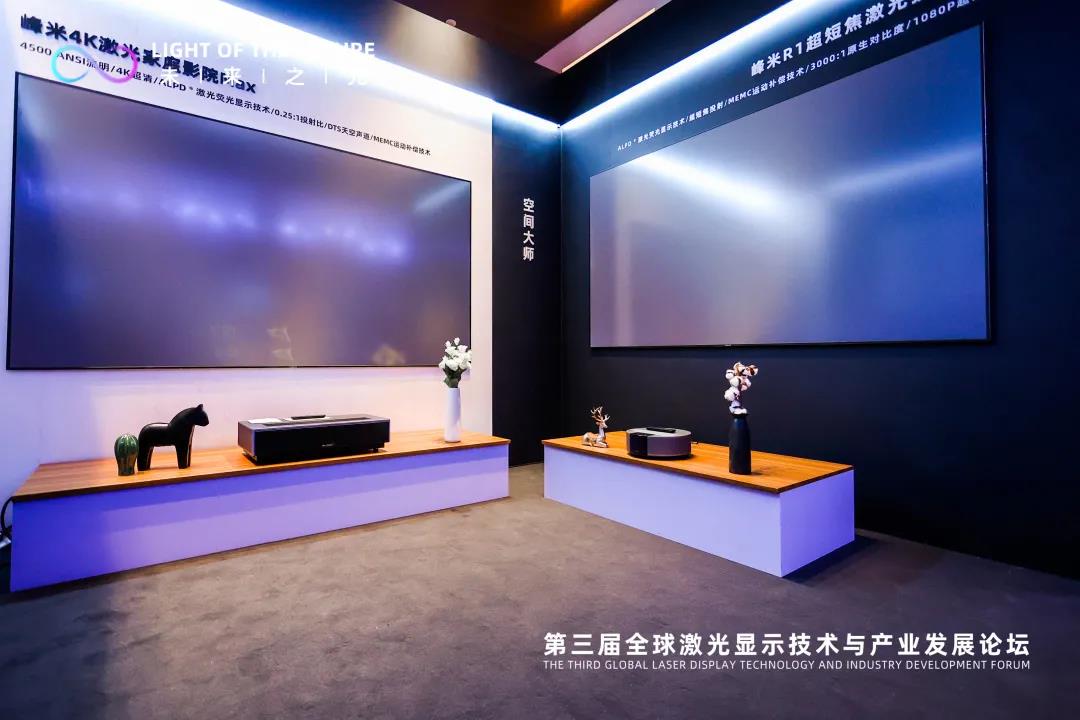 論壇現(xiàn)場,光峰科技旗下子公司峰米科技實體展示“4K激光家庭影院Max”和“峰米R1超短焦激光微投”兩款家用激光投影產(chǎn)品。