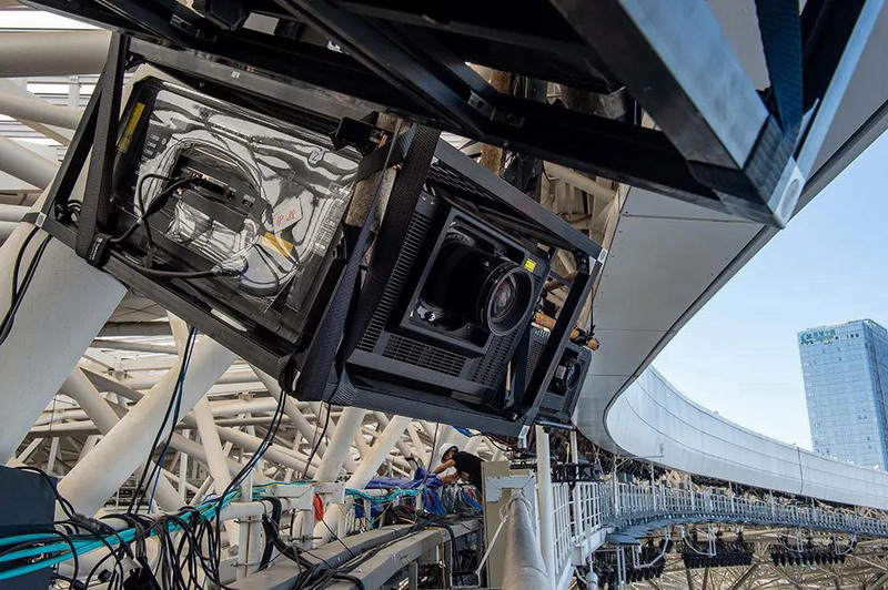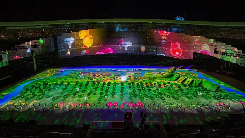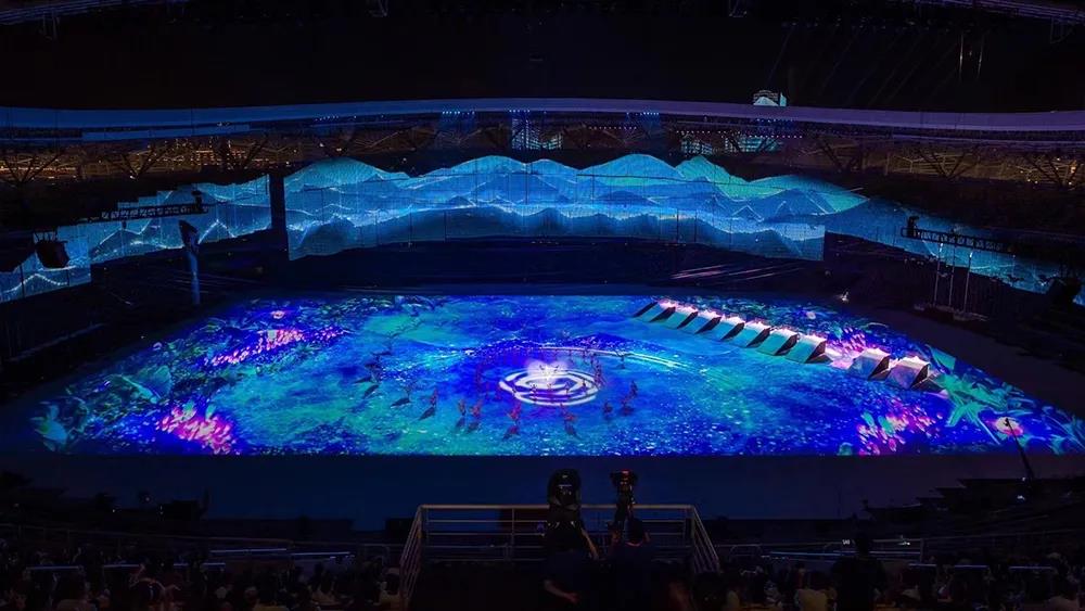 伴隨著第十四屆全運會會歌《追著未來出發(fā)》拉開了本次文體展演《奮斗新時代 奮進新征程》的序幕,13500平方米的巨幅畫面在奧體中心的地面上鋪開,漆黑的夜色將觀眾的視角團團包裹,地面則化身為巨大“熒幕”…… 據(jù)了解,此次開幕式的地面投影部分共使用了26臺51,000流明的松下紅藍雙色激光機PT-SRQ50KC以及50臺32,000流明的松下激光光源工程投影機PT-SRZ34KC,與演員舞者們相互配合,相輔相成,共同呈現(xiàn)出精美震撼的舞臺!
