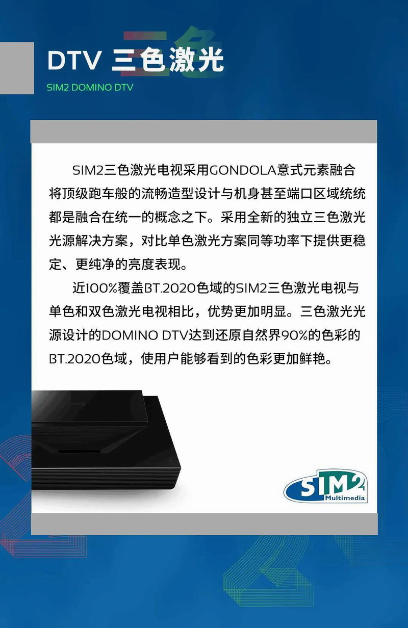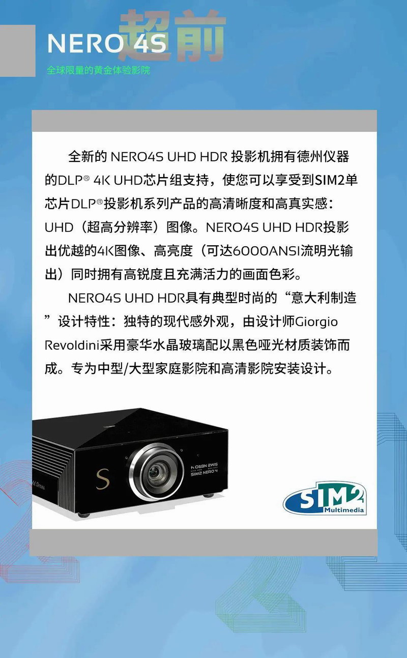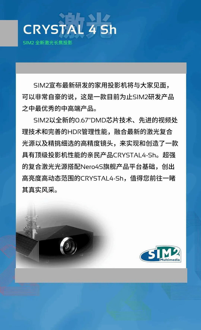 意大利SIM2投影機借此契機攜最新最熱的家用投影亮相本屆展會,效果演示:DTV-三色激光超短焦投影機;靜態(tài)展示-SIM2水晶玻璃外形款全系列投影機:xTV 4k(超短焦激光投影),Crystal4 sh(復(fù)合激光光源正投投影機),Nero4s旗艦款以及Domino4入門基礎(chǔ)款。一定能找到一款適合你的高端家用投影機,等你來看哦~