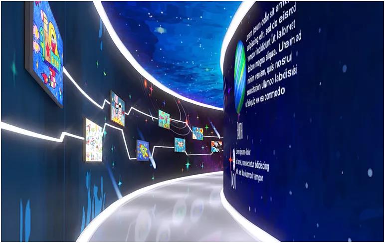 國(guó)畫(huà)激光投影機(jī)在影院等候區(qū)為觀眾提前打造宇宙空間的沉浸感,深藍(lán)色空間星羅棋布鑲嵌著鉆石,撒上鉆石的粉末,星星點(diǎn)點(diǎn)的天空畫(huà)面逐步引起人們對(duì)宇宙深處無(wú)限的遐想。本方案利用了2個(gè)弧形墻面,用4臺(tái)投影機(jī)兩兩融合,將星空打滿整個(gè)墻面,每副畫(huà)面尺寸達(dá)8平米,在人們觀看主題影片前,這個(gè)空間提前營(yíng)造了宇宙探索的氣氛感,面對(duì)廣闊無(wú)垠的浩瀚星辰,人們的思緒好像航行在寬闊的銀河向著遙遠(yuǎn)的星球出發(fā)。