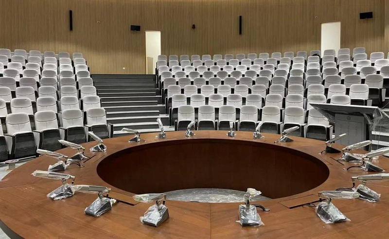 圓桌會(huì)議廳采用了HCS-4891R系列會(huì)議發(fā)言單元,全金屬方柱麥,4.3'觸摸屏可顯示代表信息、發(fā)言列表、發(fā)言計(jì)時(shí)、表決、同聲傳譯、會(huì)議服務(wù)等。