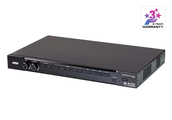 VP3520 5x2 True 4K Seamless 矩陣式演示切換器搭載控制功能,具備卓越視頻質量,帶來True 4K分辨率高達4096 x 2160@60 Hz(4:4:4)(HDMI)/4096 x 2160@60 Hz(4:2:0)(HDBaseT)。同時具有4K升頻器功能,可將輸入分辨率轉換為最佳顯示分辨率?勺詣语@示開/關控制,通過CEC、IR、RS-232、PJLink來控制顯示器,并通過繼電器控制投影儀屏幕。內置2 x 10 W功率放大器,接線端子連接器上還帶有揚聲器輸出,整體設計將易用性大大提升。