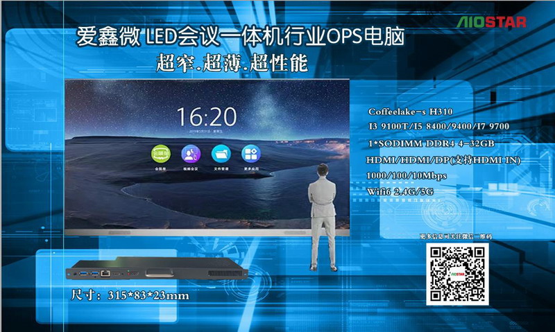 愛鑫微電腦針對LED會議一體機聯(lián)合雷曼光電、科侖特、洲明、大因、聯(lián)建、奧拓、艾比森、九洲光電、長春希達、?档萀ED廠家推出了一款行業(yè)標(biāo)準(zhǔn)規(guī)范的超窄.超薄.超性能的LED行業(yè)級OPS電腦,解決傳屏LED會議一體機單安卓系統(tǒng)的升級方案,可以快速實現(xiàn)android+windows雙系統(tǒng)方案的落地,此款LED行業(yè)級OPS插拔式電腦的主板采用intel H310芯片支持8-9代I3/I5 9400/I7 9700CPU,支持多路HDMI輸出顯示(支持多屏顯示),支持一路視頻會議的HDMI IN,同時可以支持WIFI6的無線網(wǎng)口,如此高性能的LED行業(yè)OPS電腦可以滿足LED行業(yè)高端客戶對不同產(chǎn)品的定制需求。