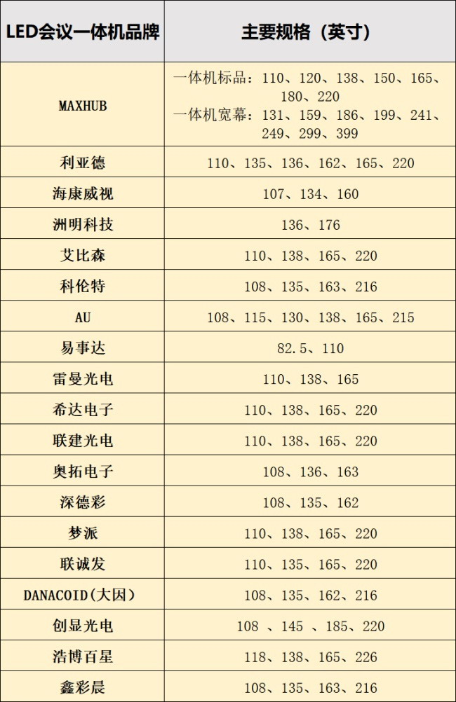 從目前眾多的LED企業(yè)在LED會議一體機上的布局看,尺寸范圍在110-220寸之間,可以看出多廠商在135/136/138寸(統(tǒng)稱為138寸)上均有布局;